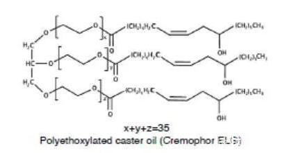 另一類重要的非離子表面活性劑是聚氧乙烯蓖麻油(Cremophor)或聚氧乙烯氫化蓖麻油(Cremophor RH)。蓖麻油是蓖麻油甘油三脂,與環(huán)氧乙烯反應(yīng),親水性的氧化乙烯結(jié)構(gòu)便插入到蓖麻酸和甘油之間,便得到了聚氧乙烯蓖麻油,如果蓖麻油中的雙鍵加氫飽和后,再與環(huán)氧乙烯反應(yīng),那么得到的便是聚氧乙烯氫化蓖麻油。環(huán)氧乙烯和蓖麻油的反應(yīng)位點(diǎn)是隨機(jī)的,因此得到的表面活性劑是一種混合物,也包括未反應(yīng)的蓖麻油和均聚形成的聚氧乙烯。不同種類的聚氧乙烯蓖麻油或聚氧乙烯氫化蓖麻油是通過(guò)參與反應(yīng)的氧化乙烯和蓖麻油或氫化蓖麻油的比例決定的,例如Cremophor EL 40或Cremophor RH 40,其中40代表的便是混合物中氧化乙烯和蓖麻油的摩爾比。這類表面活性劑的HLB一般在12以上,常用作難溶性藥物的增溶。
