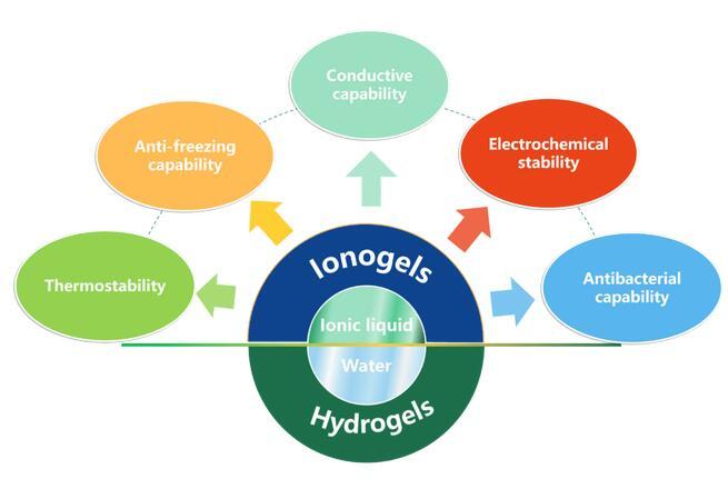 圖1.離子凝膠相比于水凝膠的特殊性能