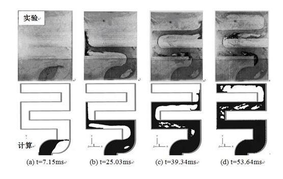 S形型腔充型過程的SPH數(shù)值模擬結(jié)果和實驗結(jié)果[9]對比