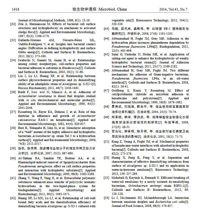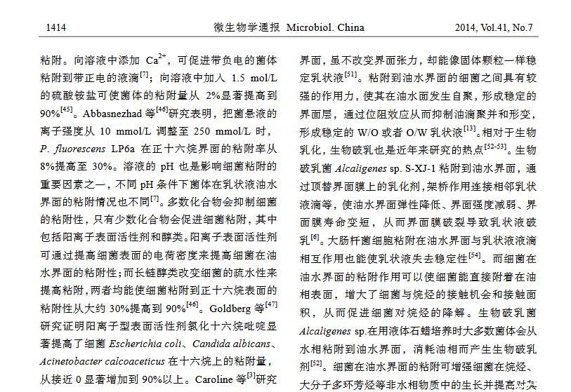摘 要:細(xì)菌在油水界面粘附主要應(yīng)用于烷烴污染的環(huán)境修復(fù)、石油開采與加工、食品加工等方面,其研究已經(jīng)引起各界的廣泛關(guān)注。本文基于 XDLVO 理論闡述細(xì)菌在油水界面的粘附機理;總結(jié)細(xì)菌表面特性、油相及水相性質(zhì)對細(xì)菌粘附的影響;介紹細(xì)菌粘附作用在微生物驅(qū)油、生物乳化與破乳以及烷烴降解方面的應(yīng)用,并對今后的研究方向提出展望。