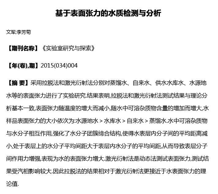 【摘要】:采用拉脫法和激光衍射法分別對蒸餾水、自來水、供水水庫水、水源地水等的表面張力進行了實驗研究。結果表明,拉脫法和激光衍射法測試結果與理論分析基本一致,表面張力隨溫度的增大而減小,隨水中可溶雜質物含量的增加而增大,水樣品表面張力的大小依次為:水源地水水庫水自來水蒸餾水。水中可溶雜質物與水分子相互作用,強化了水分子團簇締合結構,使得水表層內分子間的平均距離減小,處于表層上的水分子平均間距大于表層內水分子的平均間距,從而導致表層分子間作用力增強,表現為水的表面張力增大。激光衍射法是動態(tài)法測試表面張力,測試結果受汽相影響較大。因此拉脫法的結果相對于激光衍射法更接近于水表面張力的理論值。