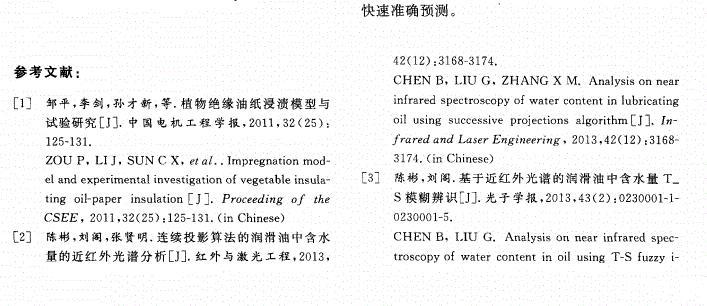 【摘要】:為了有效監(jiān)控絕緣油的運(yùn)行狀態(tài),采用定量分析方法探討了微量水分對(duì)絕緣油表面張力的影響規(guī)律。通過配制不同微水含量的絕緣油樣,對(duì)每組油樣進(jìn)行表面張力測(cè)試,然后對(duì)油樣進(jìn)行紅外光譜掃描,獲取了油樣中水分在特征波數(shù)處(1 640,3 400,3 450,3 615cm-1)的吸光度值。分析了油液中2,6-二叔丁基對(duì)甲酚(T501)等添加劑對(duì)油樣表面張力變化規(guī)律的影響。結(jié)果表明:油樣中水分含量與水分特征吸光度值之間有較好的相關(guān)性(相關(guān)系數(shù)分別為0.964 1,0.984 8,0.984 5,0.944 0),油樣表面張力和1 640,3 400,3 450,3 615,3 650cm-1波數(shù)處油樣吸光度值的變化亦均呈現(xiàn)良好的正相關(guān)性。建立了油樣表面張力與特征波數(shù)處油樣吸光度值的多元線性回歸模型,擬合精度為0.992 8;根據(jù)模型得到的表面張力計(jì)算值與實(shí)際測(cè)量值誤差為-0.07~0.06%,吻合性較好。文中的實(shí)驗(yàn)可為含微水絕緣油的表面張力檢測(cè)提供理論支撐。