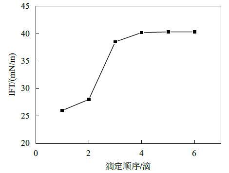 結(jié)果表明,液滴懸置5 min后,第一滴液滴表面張力值最小,隨著連續(xù)滴定的進(jìn)行,液滴表面張力值逐漸增大,最終趨于平衡。究其原因,可能是由于懸置一段時(shí)間后,表面活性劑分子在表面充分吸附,所以第一滴液滴表面張力最小,而隨著連續(xù)滴定進(jìn)行,由于平衡時(shí)間較短,表面活性劑分子在液滴的表面吸附未達(dá)平衡,所以數(shù)值逐漸增大,然而滴加液滴的速度一定,表面活性劑分子在表面的遷移速率一定,降低表面的能力與效率一定,最終會(huì)達(dá)到一個(gè)穩(wěn)定值。而平衡時(shí)間的長(zhǎng)短,與表面活性劑分子的性質(zhì)有關(guān),遷移吸附速率快的表面活性劑分子所需時(shí)間較短。由此可見,使用懸滴法測(cè)定表面張力時(shí),時(shí)間效應(yīng)的影響不可忽略。
