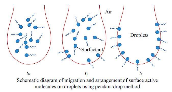 結(jié)果表明,在動(dòng)態(tài)表面張力曲線圖中,A,B,C三種樣品在60 mg/kg的較低含量下,表面張力均呈現(xiàn)先快速降低而后緩慢降低最終達(dá)到平衡的趨勢(shì),表明表面活性劑分子在液滴表面上確實(shí)存在著隨時(shí)間變化逐漸吸附平衡,排列完整的現(xiàn)象,如圖4所示,表面活性劑分子在表面完全吸附、排列緊密需要一定的時(shí)間,顯然在使用懸滴法進(jìn)行測(cè)定時(shí),時(shí)間效應(yīng)直接影響著表面張力測(cè)定的誤差大小,符合前文所述結(jié)論。而樣品B在100 mg/kg含量下,動(dòng)態(tài)表面張力趨勢(shì)圖成一條直線,證明該種表面活性劑在液滴表面遷移速度較快,在液滴完全注射形成之前已快速到達(dá)平衡狀態(tài),表面活性劑分子在表面得以充分排布,這解釋了較低含量的表面活性劑溶液的靜態(tài)表面張力與國(guó)標(biāo)推薦方法吻合程度差異較大的原因。這是由表面活性劑分子自身性質(zhì)所決定的,與其極性基的類型、結(jié)構(gòu)、個(gè)數(shù)、疏水基長(zhǎng)度等息息相關(guān)。而單一液體,未具有含量差,故不存在表面活性劑分子從溶劑內(nèi)部遷移吸附至表面這一過程,所以其動(dòng)態(tài)表面張力曲線呈現(xiàn)為平穩(wěn)直線。