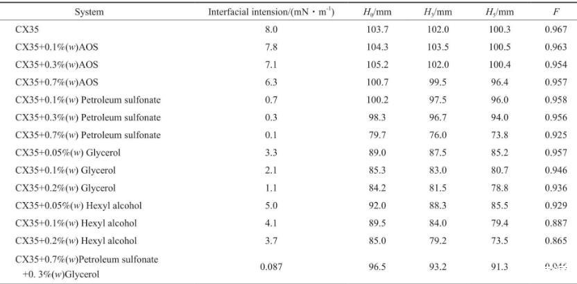 CX35雖具有降低油水界面張力的能力,但加入CX35后,油水界面張力仍大于10-1mN/m數量級。離子型表面活性劑與醇混合可降低油水界面張力,但醇會影響驅油劑的起泡性能。不同復配體系的油水界面張力見表1。由表1可看出,石油磺酸鹽降低界面張力的效果尤為突出。這是因為,石油磺酸鹽含苯環及類苯結構,且苯環上有疏水碳鏈,與原油中的瀝青質和芳烴等物質結構相似,故石油磺酸鹽易吸附在油水界面上從而降低油水界面張力。同時,石油磺酸鹽還可提高驅油劑在空隙中的洗油效率,也可通過乳液產生的阻力提高驅油劑的波及效率。在m(CX35)∶m(石油磺酸鹽)∶m(甘油)=1∶0.7∶0.3的條件下得到的ZX35的起泡高度可達到95 mm以上,穩泡能力達到0.946。