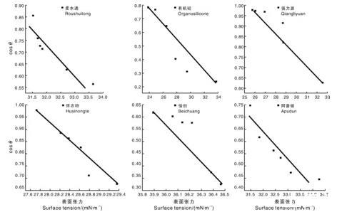 添加合適的噴霧助劑可以改善農藥的噴霧性能,增強農藥對靶標物的沉積性,進而增強防治效果。合理使用噴霧助劑可以降低藥液的表面張力和接觸角。盡管表面張力并非增強藥液在靶標物上持留和鋪展的唯一因素,但是表面張力能夠影響霧滴的大小,從而改變藥液在靶標上的沉積量。本文綜合研究了不同類型的噴霧助劑對吡蟲啉、阿維菌素和苦參堿3種藥劑表面張力和接觸角的影響,并分析了3種藥劑在添加不同質量濃度的6種噴霧助劑后藥液的表面張力與接觸角間的關系。結果表明,6種噴霧助劑均能降低3種藥劑的表面張力和接觸角。添加不同質量濃度的噴霧助劑后,藥液的表面張力與接觸角的余弦值存在顯著的負相關關系,與以往研究報道的結果一致。