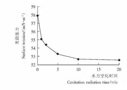 空化時間對原糖溶液表面張力的影響配置濃度為0.15g/mL的原糖溶液3.5L,水浴加熱溶液到60℃,在0.2 MPa壓力下通過空化裝置循環不同的時間(1,2,5,10,20min),測定空化前后原糖溶液的表面張力的變化。