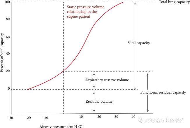 它展示了經(jīng)典的肺順應(yīng)性曲線,在低和高容量時順應(yīng)性較差,但在FRC之上,即在正常潮氣量的范圍內(nèi)是最佳的。