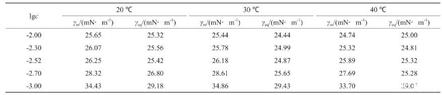 采用JK99C型表面張力儀由低濃度至高濃度測定恒溫后系列溶液的表面張力(γ),做γ-lgc(c為濃度)曲線。測試均在帶有恒溫夾套的玻璃杯中進行,外接數控超級恒溫槽,溫度控制在預設溫度,溫度選擇為20,30,40℃。