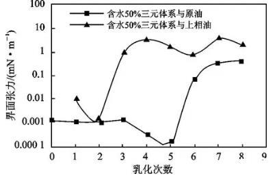 從總體上看,水相與原油間的界面張力低于其與上相油間的界面張力,在乳化第6次以后兩者開始趨同。說明乳化會導致油相中的組成發生變化,進而導致油相性質發生變化。因此在復合驅驅替的適當時機應對驅油體系的配方進行相應調整。