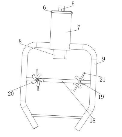 步驟三:在兩根出液管帶動加強桿轉動的同時將帶動渦輪葉片轉動,使轉動的渦輪葉片能夠通過轉軸帶動攪拌桿轉動,使攪拌桿對混料桶內的試劑溶液進行橫向攪拌混合,提高混合效果。