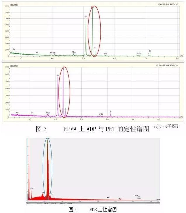 結果顯示無論是EPMA-1720上的ADP晶體還是PET晶體,其分辨率都毫無疑問地能把S Ka(特征波長0.5373nm)和Pb Ma(特征波長0.5285nm)明顯的區分開來,呈現的是分開的兩個峰,見圖3中的紅色線內。而相同測試條件下的EDS譜圖中S Ka峰(特征能量2.308keV)已然不能使用軟件自動識別標出,手動添加的結果見圖4,其與Pb的Ma峰(特征能量2.343keV)重疊在一起,不能分開。