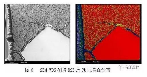 圖6為某廠商生產的SEM+WDS測試結果。其測試的大小范圍受限,還不到EPMA測試區域的一半,(EPMA可以使用樣品臺掃描,實現更大區域的分析)也就不能查看整個負極板上待測元素的分布結果。由于S元素的含量很低,測試沒有給出結果。