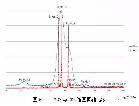 我們把此兩個譜圖放到一個坐標軸上就能更好的對比,組合中圖5的橫軸為能量(單位keV),WDS的分辨率比EDS高出一個數量級。