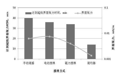 mN/m;手動混搖的方式達到超低界面張力的時間最長,為40分鐘,電動攪拌和磁力攪拌差別不大?;靹蚱鲾嚢璺绞绞谷芤耗茉诙虝r間內達到均相且均相程度高,均相程度越高,達到超低界面張力的時間越短。