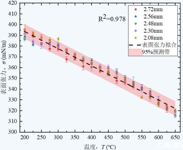 上圖6給出了溫度T在200~650℃范圍內,使用不同管徑毛細管測量的液態鋰表面實驗值及其擬合曲線。可知,擬合結果具有良好線性度。各個溫度點的密度實驗結果偏差小于±5 mN/m,相對誤差為±1.4%,且實驗結果均在線性擬合95%預測帶中,說明實驗結果具有較好可信度。